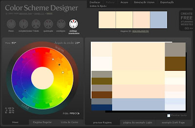 Mas obviamente nem tudo está perdido; dá pra ter alguma ajuda enquanto não se pega a prática da combinação de cores; uma dica para se começar a ter essa noção é visitar sites como o Colors Scheme Designer Você pode simplesmente clicar em random e conseguir um esquema de cores como o abaixo, ou ir determinando matizes, contraste, brilho, saturação; o site retorna então as melhores combinações, basta você escolher a que mais lhe agradar. Em lista de cores, você encontra ainda o código de cada uma das cores da combinação escolhida.